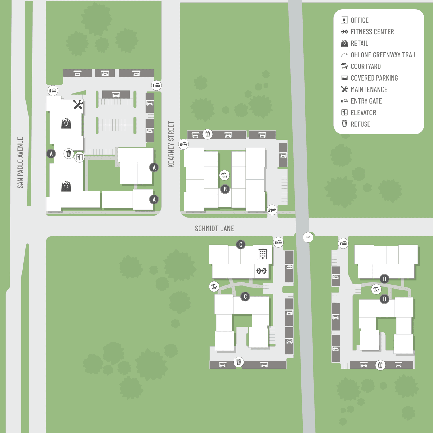 Select a floor plan or bedroom count to view those units on the overhead view on the site map. If you need assistance finding a unit in a specific location please call us at 510-924-4188 TTY: 711.